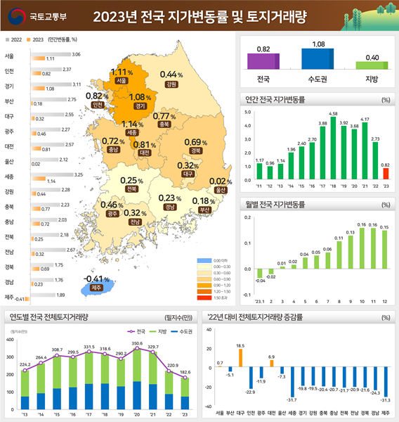 [아유경제=송예은 기자] 국토교통부(장관 박상우)와 한국부동산원(원장 손태락)이 발표한 2023년 연간 지가변동률 및 토지거래량 발표 결과에 따르면 작년 전국 지가는 0.82% 상승했다. 상승폭은 2022년 대비 1.91%p, 2021년 대비 3.35%p 축소된 것으로 나타났다.