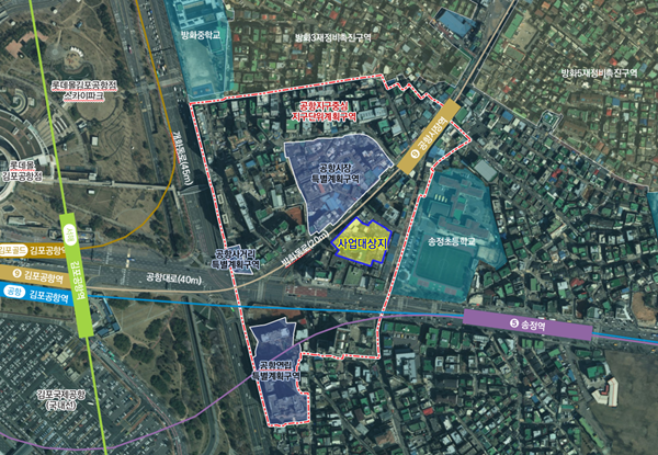 대상지는 공항대로변 지하철 5호선 송정역과 9호선 공항시장역 인근 역세권 지역으로, 개화동로 주변으로 김포공항과 롯데백화점 등 대형 상업시설이 입지해 교통과 접근성, 상권이 우수한 지역이나, 이면부는 도로 등 기반시설이 열악하고 노후 건축물이 밀집되어 있어 도시환경 개선이 필요한 지역이다.