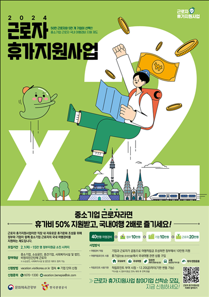 [아유경제=송예은 기자] 문화체육관광부(장관 유인촌ㆍ이하 문체부)-한국관광공사(이하 관광공사)가 오는 2월 1일부터 선착순으로 `근로자 휴가 지원 사업`에 참여할 기업과 근로자를 모집한다고 밝혔다.