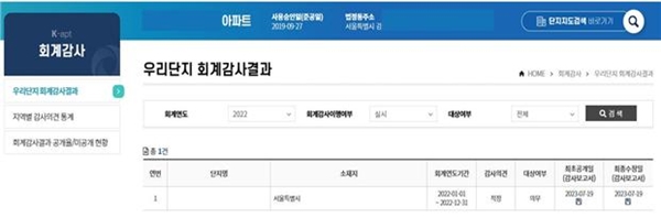 [아유경제=조명의 기자] 한국부동산원은 「공동주택관리법」 개정에 따라 올해부터 공동주택 외부회계감사 공개단지 기준이 분양 300가구 이상 공동주택에서 의무관리대상 공동주택 전체로 확대됐다고 이달 26일 밝혔다.