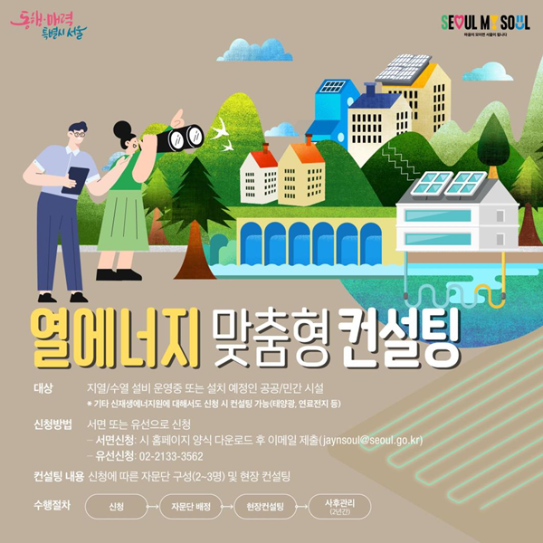[아유경제=송예은 기자] 서울시(시장 오세훈)가 지열에너지 설치 사업장의 필요 분야에 맞게 지원해 주는 맞춤형 무료 컨설팅을 오는 2월부터 실시한다고 밝혔다.