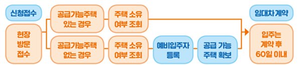 신청 가능한 주택은 현재 거주지와 상관없이 전국 LH 주거복지지사와 사전 상담을 통해 확인 가능하며, 해당 주거복지지사에 방문해 신청하면 된다. 해당 지역에 즉시 입주 가능한 주택이 없을 경우에는 예비입주자로 등록할 수 있다.