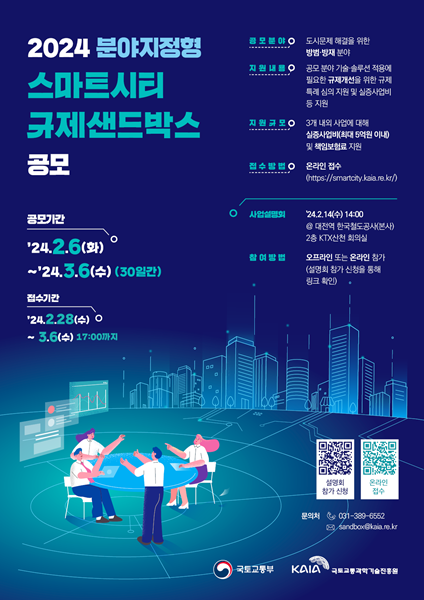 [아유경제=송예은 기자] 국토교통부(장관 박상우)는 규제샌드박스 활용이 부족한 분야를 발굴해 규제 해소를 지원하는 분야지정형 규제샌드박스 공모를 신설한다고 밝혔다. 보다 다양한 스마트도시 기술ㆍ서비스의 규제완화를 지원하는 것이 목적이다.