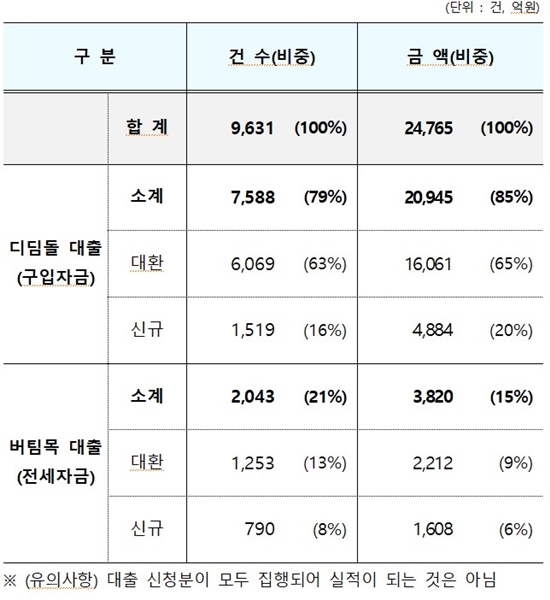 디딤돌 대출 중 대환 용도는 6069건ㆍ1조6061억 원, 신규 주택 구입 용도는 1519건ㆍ4884억 원으로, 금리 부담을 완화하기 위해 기존 대출을 저리의 신생아 특례대출로 전환하려는 수요가 많은 것으로 파악됐다.