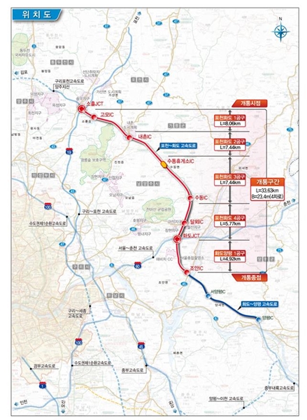 이번 개통으로 포천시 소홀읍에서 남양주시 조안읍까지의 이동거리는 약 16㎞ 감소(50㎞→33.6㎞)하고 주행시간은 약 30분 단축(55분→20분)될 것으로 예상된다.