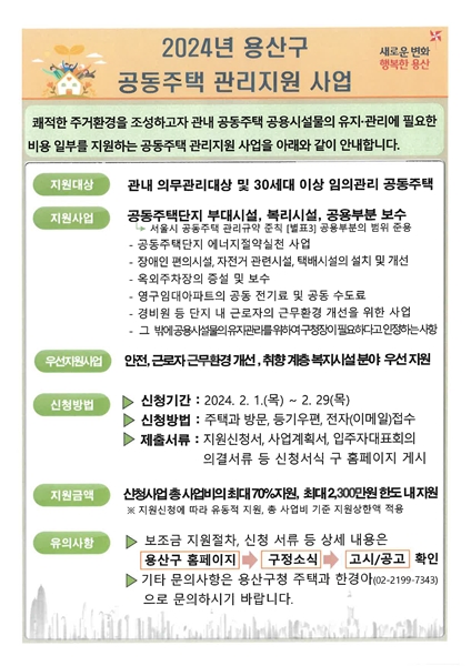 [아유경제=송예은 기자] 서울 용산구(청장 박희영)는 이달 29일까지 지역 내 공동주택을 대상으로 `2024년 공동주택관리 지원사업`을 공모한다고 밝혔다. 공동주택 관리와 안전에 필요한 비용의 일부를 지원해 안전하고 쾌적한 주거환경을 조성하기 위함이다.
