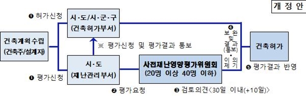 아울러 초고층 건축물의 건축을 하기 전에 재난발생 위험요인을 사전 검토하는 제도인 ʻ사전재난영향성검토협의ʼ의 명칭을 국민이 이해하기 쉽도록 ʻ사전재난영향평가ʼ로 변경하고, 건축주 등이 직접 사전재난영향평가를 신청할 수 있도록 절차를 간소화했다. 신청인에 대한 평가 결과의 통보 및 이의제기 절차를 도입해 이해관계인의 권익 보호를 강화했다.