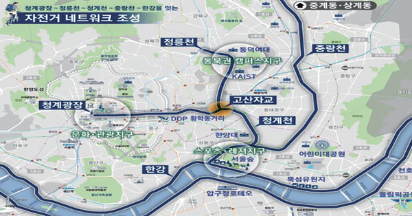 이 외에도 정릉천~청계천~신답철교에 이르는 485m의 자전거도로도 신설하고, 신답철교~중랑천 합류부의 노후 자전거도로 1140m 구간은 재포장해 명실상부 도심을 잇는 편리한 자전거 네트워크를 완성했다.