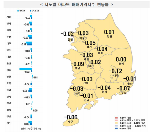 지방(-0.05%)은 시ㆍ도별로 부산(-0.07%), 대전(-0.02%), 대구(-0.12%), 충남(-0.09%), 충북(-0.04%), 강원(0.01%), 광주(-0.03%), 울산(-0.01%), 세종(-0.03%), 전남(-0.01%), 전북(-0.03%), 경남(-0.04%), 경북(0%), 제주(-0.06%) 등의 결과를 보였다.