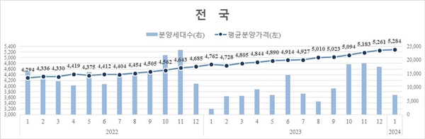 서울 및 수도권, 5대 광역시ㆍ세종시의 민간아파트 분양가격은 모두 상승했으나 기타 지방은 하락했다. 특히 지난 1월 말 서울 민간아파트의 평균 분양가는 ㎡당 1123만4000원으로 전월(1059만 원)보다 6.07% 올랐고 특히 전년 동월(928만2000원)에 비해서는 21.03%로 크게 상승했다.