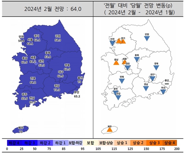전국 주택경기전망지수는 2023년 12월 63.3에서 지난 1월 66.7로 소폭 올랐다가 이달 다시 64로 떨어졌다.