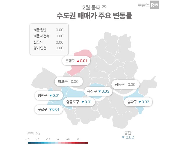 자치구별로는 ▲용산(-0.03%) ▲송파(-0.02%) ▲구로(-0.01%) ▲양천(-0.01%) ▲영등포(-0.01%) 등이 하락했고 ▲광진(0.02%) ▲은평(0.01%) 등은 올랐다.