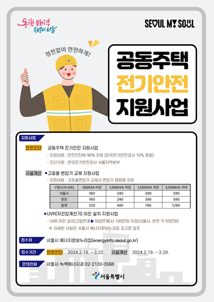 이에 시는 공동주택을 대상으로 전기설비 안전진단 지원, 고효율 변압기 교체 지원, 저전압계전기(UVR) 이전 설치 지원 등을 추진해 전기안전 관리에 힘을 보탠다.