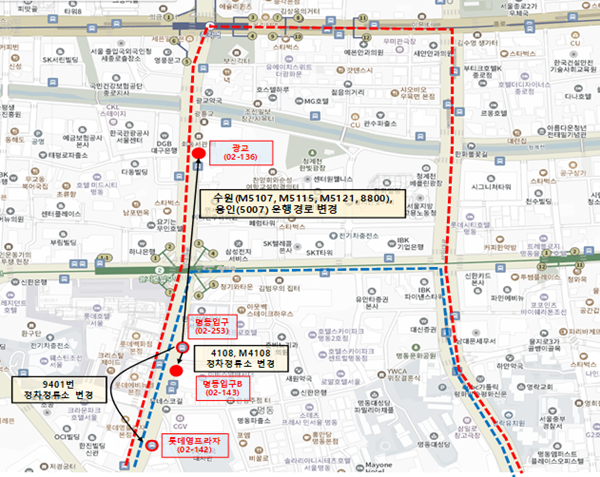 또한 남대문세무서(구 백병원) 정류소에 대해서도 인접 가로변 정류소로 분산 배치할 경우 삼일대로 통행시간이 약 5% 단축될 것으로 예상됐다.
