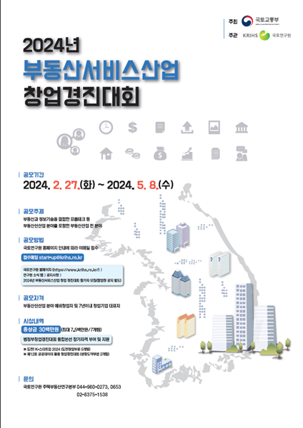 [아유경제=송예은 기자] 국토연구원이 주관하는 `2024 부동산서비스산업 창업경진대회(이하 경진대회)` 접수가 시작됐다.