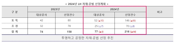 LH 관계자는 "중소기업의 참여 기회 제공 및 투명하고 공정한 자재ㆍ공법 선정을 위해 연간계획을 공개하고 있으며, 앞으로도 건설업계 목소리를 지속적으로 청취해 개선사항을 적극 발굴해 나갈 것"이라고 밝혔다.