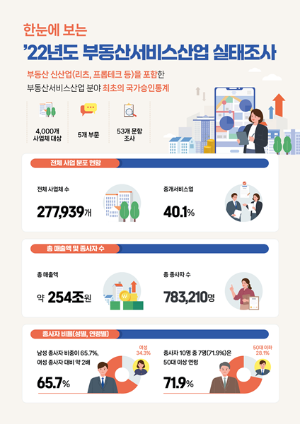 [아유경제=송예은 기자] 국토교통부(장관 박상우)는 전국 표본 4000개의 사업체를 대상으로 조사한 2022년도 부동산서비스산업 실태조사 결과를 공개한다고 밝혔다.