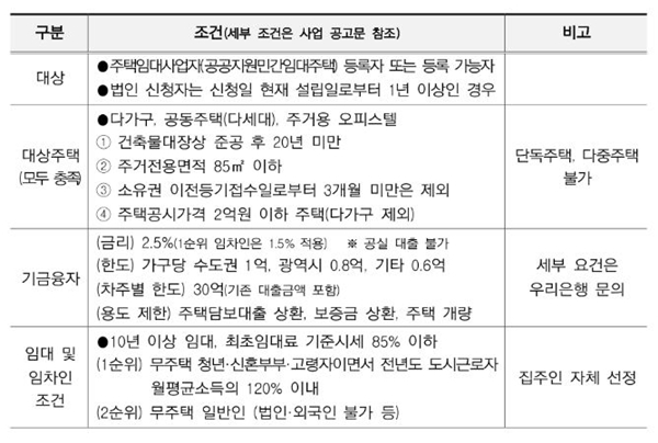 이는 「공공지원민간임대주택 등에 관한 업무처리지침」에 따른 것으로, `집주인 융자형 임대주택사업`은 민간임대주택 사업자에게 저리의 기금을 융자해서 이자 부담을 줄여주는 대신 해당 주택을 무주택 청년ㆍ고령자ㆍ신혼부부 등 주거 취약계층에 10년 이상 저렴하게 장기 임대하는 제도이다.