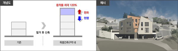우선, 노후저층주거지의 신축이나 리모델링 활성화를 위해 특별건축구역, 건축협정 집중구역, 리모델링 활성화구역 지정을 통한 용적률 등 건축기준을 완화한다. 특별건축구역, 건축협정 집중구역, 리모델링 활성화구역은 건축위원회 심의 등을 거쳐 지정될 수 있으며 지정 시 조화롭고 창의적인 건축을 위해 건폐율, 용적률, 높이, 조경 면적 등 각종 건축기준을 배제 또는 완화해 적용받을 수 있다.