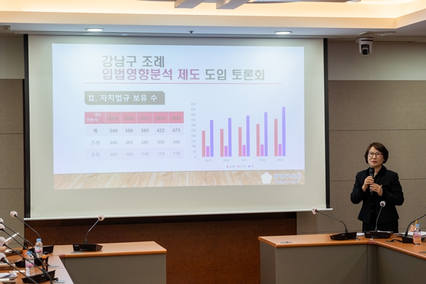 [아유경제=조현우 기자] 강남구의회 노애자 의원(국민의힘ㆍ비례)은 지난 21일 오후 2시 강남구의회 6층 열린회의실에서` 조례 입법영향분석 제도 도입 토론회`를 개최했다.