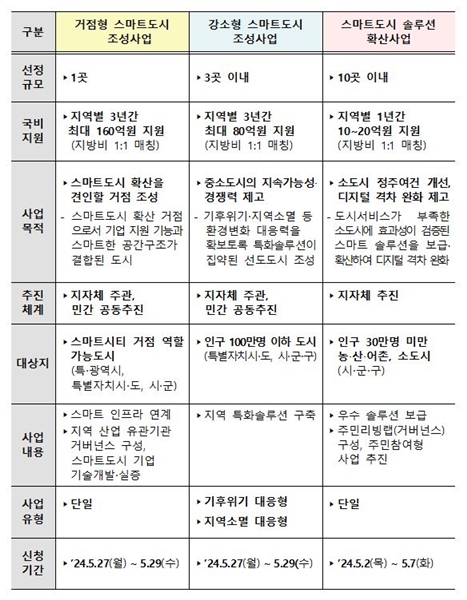 올해는 ▲도시 전역에 종합솔루션을 실증, 스마트 거점을 조성해 스마트도시 확산을 이끌 거점형 ▲기후위기ㆍ지역소멸 등 환경변화에 대응하는 선도도시 조성을 위한 강소형 ▲우수한 솔루션을 보급 지원하는 솔루션 확산형 등 3가지 유형의 사업을 추진한다.