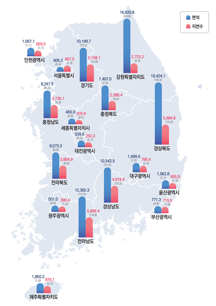 전국 17개 광역자치단체 중 면적이 큰 순서는 경북 1만8424㎢(18.3%), 강원 1만6831㎢(16.8%), 전남 1만2362㎢(12.3%)으로 나타났다. 작은 순서로는 세종 465.0㎢(0.5%), 광주 501.0㎢(0.5%), 대전 539.8㎢(0.5%) 순이다.