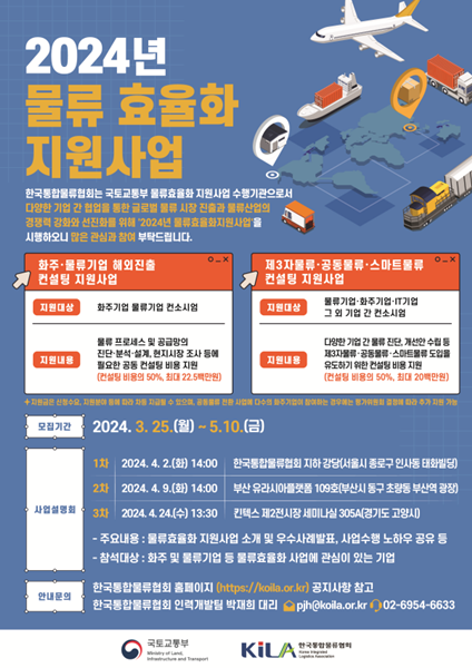 설명회에서는 물류 효율화 지원사업의 주요 내용과 우수 사례를 소개한다. 현장 질의응답을 통해 사업에 관심 있는 기업들의 이해를 돕고, 공모 참여방법도 자세하게 안내할 예정이다.