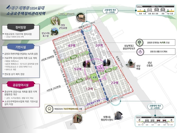 이에 따르면 성남여중 서측에 있는 태평동 관리지역은 당초 2개 구역에 대한 소규모주택정비사업을 계획했으나 이번 계획 변경을 통해 전체 관리지역을 5개 구역으로 구분해 전 구역에서 가로주택정비사업을 진행한다. 이곳에 지하 2층에서 지상 20층 규모의 공동주택 2377가구가 공급된다.
