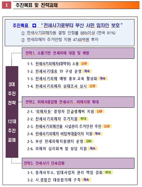 이번 계획은 좀 더 세밀한 피해 대응을 위해 소통과 예방에 중점을 두고, `전세사기로부터 부산 서민 임차인 보호`를 목표로 3대 추진전략 12대 추진과제를 담았다.
