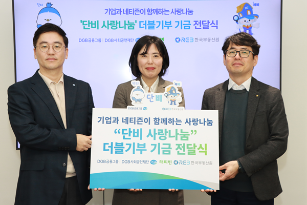 [아유경제=송예은 기자] 한국부동산원(원장 손태락)은 DGB금융그룹(회장 황병우)과 공동으로 `해피빈 더블기부` 사업을 실시한다고 밝혔다. 이 사업은 네이버의 온라인 기부플랫폼 `해피빈`을 활용해 진행된다.