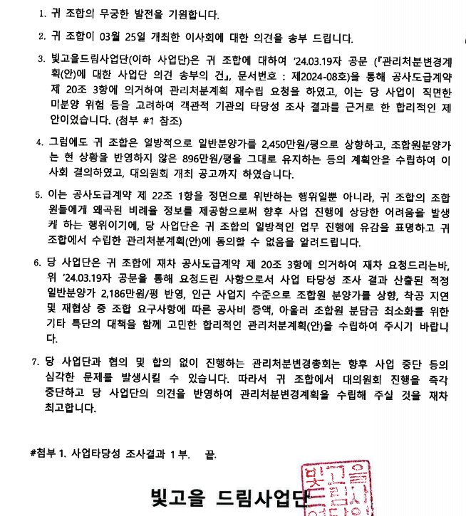 반면 조합 측 공문 내용은 예정된 관리처분 변경총회를 진행하고 향후 미분양시 관리처분계획 변경을 해 부족한 재원을 마련하겠다는 골자로 답변하고 있다. 또 조합을 지지하는 측 조합원들은 "급격한 물가 상승과 하이엔드 적용으로 단지 고급화에 따라 공사비가 상당히 증가했고, 이를 감당하려면 일반분양 가격 상승은 불가피"라면서 "관리처분총회 통과 조건이 전체 조합원의 2/3 동의를 받아야 하는 상황에서 조합원의 부담금을 늘릴 수는 없으며 조합원에게 긍정적인 사업성을 보여줄 수밖에 없다"고 피력한 것으로 알려졌다. 그리고 올해 하반기 미국의 금리 인하로 인해 부동산시장이 상승세를 보일 것이라 주장했다.