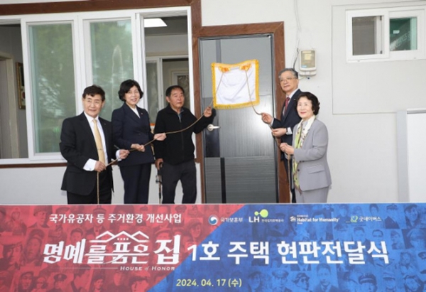 이날 현판식에는 이한준 LH 사장과 강정애 국가보훈부 장관, 윤형주 한국해비타트 이사장, 이호균 굿네이버스 이사장 등이 자리해 함께 주거환경 개선 결과를 점검하고 보훈예우를 위한 현판을 게시했으며, LH는 현판식 당일 국가보훈부 보훈터에서 주거취약 국가유공자의 지속적인 주거환경 개선을 위해 국가보훈부, 한국해비타트, 굿네이버스와 `2024년 명예를 품은 집 사회공헌 협약식`을 진행하고 상호 협력을 위한 협약을 체결했다.