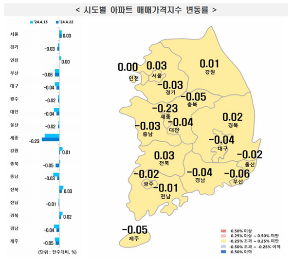 지방(-0.03%)은 시ㆍ도별로 부산(-0.06%), 대전(-0.04%), 대구(-0.04%), 충남(-0.03%), 충북(-0.05%), 강원(0.01%), 광주(-0.02%), 울산(-0.02%), 세종(-0.23%), 전남(-0.01%), 전북(0.03%), 경남(-0.04%), 경북(0.02%), 제주(-0.05%) 등의 결과를 보였다.