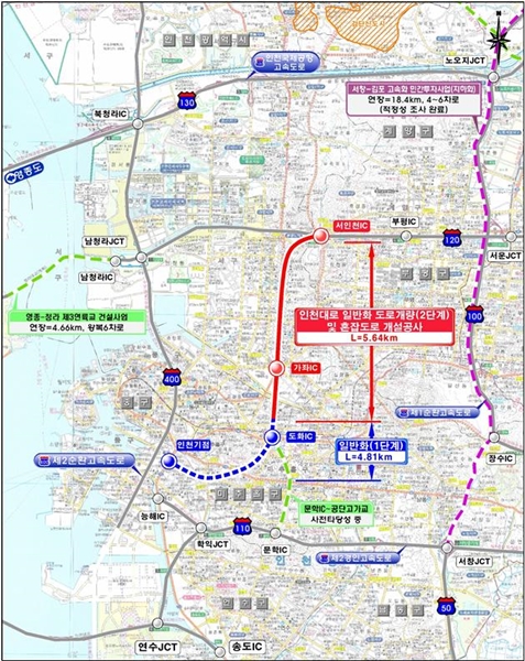 한편, 인천대로 일반화 도로개량(2단계) 공사는 인천대로 주안교차로~서인천IC까지 일반도로 5.64㎞ㆍ4차로를 건설하는 사업으로 도로 중앙에는 조경녹지, 산책로, 운동시설 등을 조성한다. 혼잡도로 개설 공사는 공단고가교~서인천까지 하부에 4차로의 지하차도(4.53㎞)를 건설한다.
