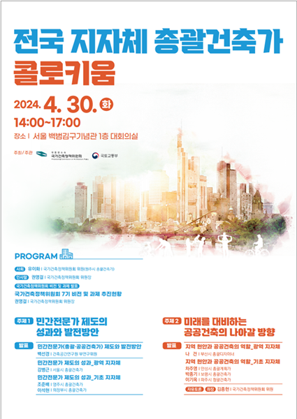 [아유경제=송예은 기자] 국가건축정책위원회(위원장 권영걸) 및 국토교통부(장관 박상우)는 `전국 지자체 총괄건축가 콜로키움`을 공동으로 개최한다. 이달 30일 열리는 이번 행사는 2008년 민간 전문가 제도 도입후 16년간의 성과를 되돌아보고 미래 공공건축의 나아갈 방향을 모색하기 위해 마련됐다.