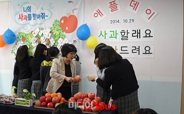 [미디어유스 라인뉴스팀] 대전도안중학교가 지난 10월 29일(수) 오전 12시 30분(점심시간) Wee Class에서 친구들과 선생님들이 함께 사과와 감사의 말을 전하는 애플데이(감사데이) 행사를 진행했다.