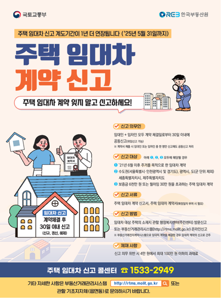 [아유경제=송예은 기자] 인천광역시는 주택의 임대차 계약 중 보증금 6000만 원 또는 월차임 30만 원을 초과하는 계약에 대해 계약일로부터 30일 이내에 신고하는 `주택임대차신고제`의 계도기간이 2025년 5월 31일까지 1년 더 연장됐다고 밝혔다.