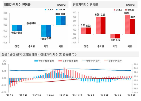 [아유경제=권혜진 기자] 최근 한국부동산원이 발표한 `주간아파트 가격동향`에 따르면 5월 2주(지난 13일 기준) 전국 아파트값은 하락(-0.02%)을 기록했다. 수도권은 보합 유지, 서울은 상승폭 유지, 지방은 하락폭 유지한 상황이다.