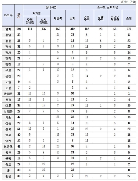 올해 3월 기준 서울시 도시정비사업 추진 정비구역은 총 690구역(재개발 247ㆍ재건축 165ㆍ소규모정비 278)으로, 자치구별로는 ▲성북구(51구역) ▲서초구(47구역) 등이 가장 많으며, 소규모 도시정비사업은 ▲성북구(29구역) ▲중랑구(27구역)가 많았다.