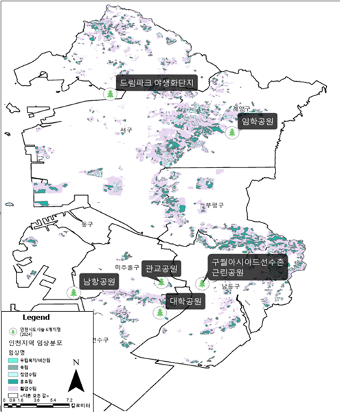 도시 숲 기능성 평가 대상으로 구월아시아드 선수촌 근린공원(침엽수림), 관교공원ㆍ대학공원ㆍ임학공원(활엽수림), 지하 하수처리시설 설치 후 상부를 공원화한 남항공원과 드림파크 야생화단지(인공조경)로 선정했다.