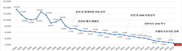 2023년 교통사고 사망자 수는 2551명이다. 사망자가 가장 많았던 1991년 대비 1/5 수준이며, 전년 대비 6.7% 감소했다. 그러나 인구 10만 명당 사망자 수는 여전히 OECD 회원국 중 중하위권 수준(2021년 기준 38개국 중 28위)에 그치고 있다.