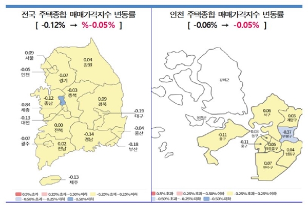 지역별로 살펴보면 연수(0.07%)ㆍ서구(0.06%)ㆍ남동(0.04%)ㆍ계양(0.03%)ㆍ동구(0.03%)는 상승했으며, 부평(-0.37%)ㆍ중구(-0.11%)ㆍ미추홀구(-0.05%)는 하락했다.