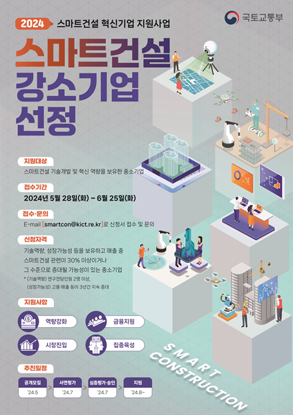 스마트건설 강소기업 선정을 희망하는 기업은 이달 28일부터 오는 6월 25일까지 공고문에 첨부된 신청서를 전자우편으로 제출해야 한다.