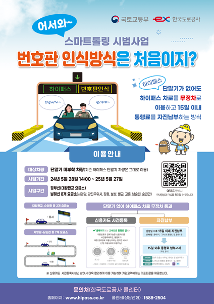 [아유경제=송예은 기자] 국토교통부(장관 박상우)와 한국도로공사(사장 함진규)는 `번호판 인식 방식 스마트톨링 시범 사업`을 추진해 고속도로 운영 효율화를 도모한다. 스마트톨링이란 무선통신(하이패스), 번호판 인식 등 첨단기술을 활용한 무정차 통행료 수납시스템을 말한다.