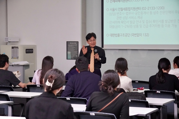 세부적으로 전월세 임대차계약 진행 시 ▲등기사항 전부증명서와 건축물대장 보는 법 ▲계약서 내용 확인 방법 ▲절대 하지 말아야 할 전ㆍ월세 계약 등 청년ㆍ사회초년생이 이해하기 쉬운 실질적인 피해 예방법 위주로 강의를 진행했다.
