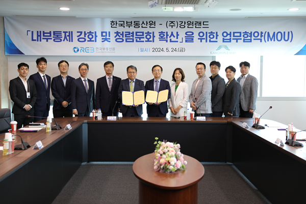 [아유경제=송예은 기자] 한국부동산원(원장 손태락)은 지난 24일 강원랜드(대표이사 직무대행 최철규)와 `내부 통제 강화 및 청렴문화 확산을 위한 업무협약(MOU)`을 체결했다고 밝혔다.