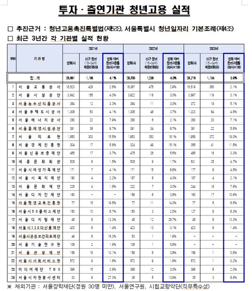 「서울특별시 청년일자리 기본조례」 개정안은 서울시 24개 투자ㆍ출연기관의 청년고용의무 비율을 4%에서 5%로 상향 조정하고, 청년 채용계획과 실적을 서울시의회에 의무적으로 제출하도록 해 청년 고용의 실행력을 높이고, 청년 채용을 선도적으로 확대하고자 하는 내용을 담고 있다.