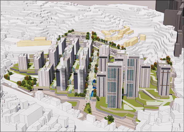 건축계획에 있어서는 구릉지의 지형 특성을 감안해 고지대, 중간지대, 간선도로변 역세권 인접 지역으로 구분해서 제1종ㆍ제2종7층ㆍ제2종일반주거지역으로 단계적 용도지역을 설정하면서 각각 배후산림을 고려한 저층 테라스하우스 배치, 중저층, 고층 주동을 배치하는 높이계획을 통해 주변 지역과 조화로운 스카이라인을 계획했다고 시는 설명했다.