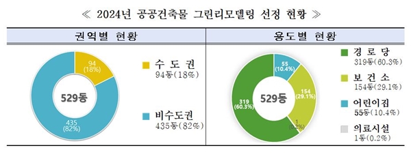 국토교통부는 공공건축물 그린리모델링사업으로 올해에는 총 529동을 선정해 지원한다고 밝혔다. 공공건축물 그린리모델링사업은 에너지효율이 낮은 건축물의 단열ㆍ설비 성능 등을 개선해 온실가스 배출을 줄이는 핵심사업이다.