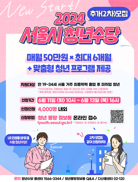[아유경제=송예은 기자] 서울시가 취업을 준비하는 청년들의 생활비를 지원하는 `청년수당` 참여자 4000여 명을 추가로 모집한다고 전했다. 오는 11일부터 13일까지 서울시 청년정책 종합 플랫폼 `청년 몽땅 정보통` 누리집에서 신청하면 된다.